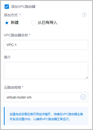 - 添加方式:选择添加VPC路由器的方式,可选择新建或从已有导入
