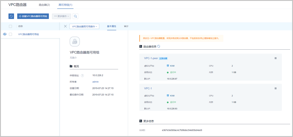 - 基本属性:基本属性页面为VPC路由器高可用组详情页的缺省栏,显示了当前VPC路由器高可用组的基本情况,包含:名称、简介、仲裁地址和所有者等信息,如Figure 15所示。在此栏可修改VPC路由器高可用组的多项参数,具体如下: