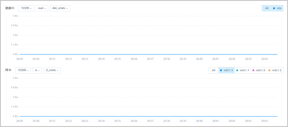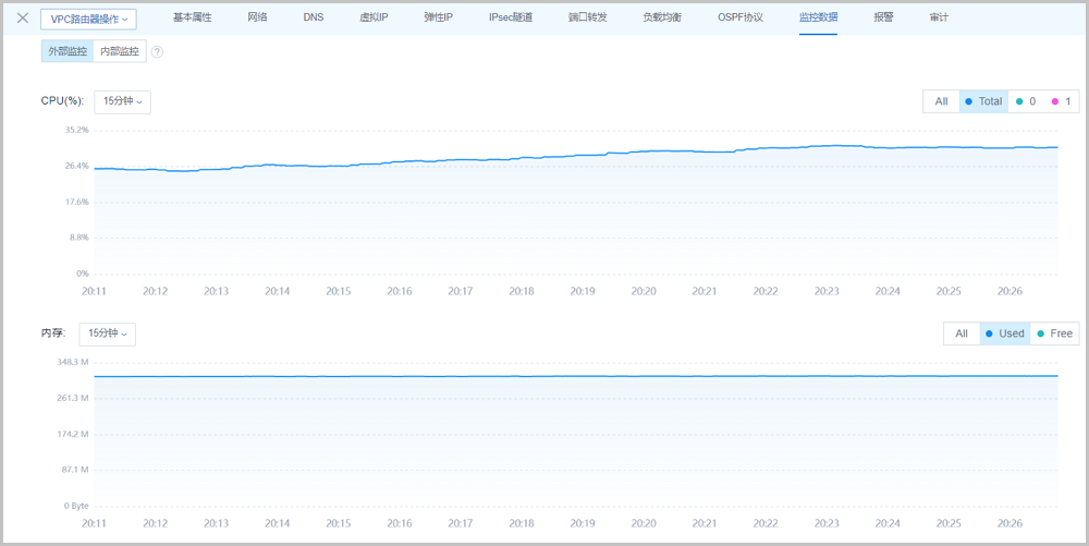 - 监控数据:监控数据页面显示了对VPC路由器的实时性能监控,包括:CPU、内存、磁盘、网卡,如Figure 11所示。