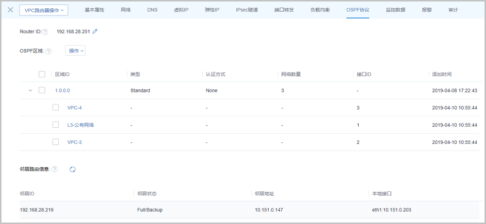将VPC路由器加入OSPF区域,同一VPC路由器可以添加到不同OSPF区域。