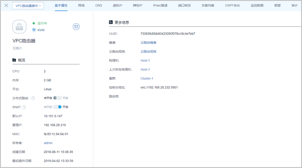- 基本属性:基本属性页面为VPC路由器详情页的缺省栏,显示了当前VPC路由器的基本情况,包含:名称、简介、状态、概览、管理节点IP和UUID等信息,如Figure 2所示。在此栏可修改VPC路由器的多项参数,具体如下: