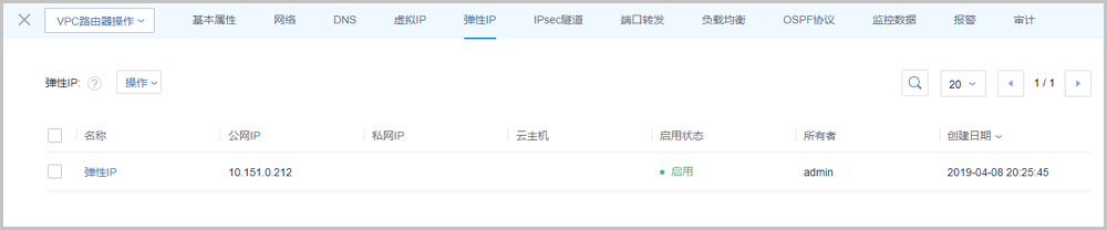 在VPC路由器管理界面,点击相应VPC路由器的名称,可展开其详情页。包含以下子页面:基本属性、网络、DNS、虚拟IP、弹性IP、IPsec隧道、端口转发、负载均衡、监控数据、报警和审计。