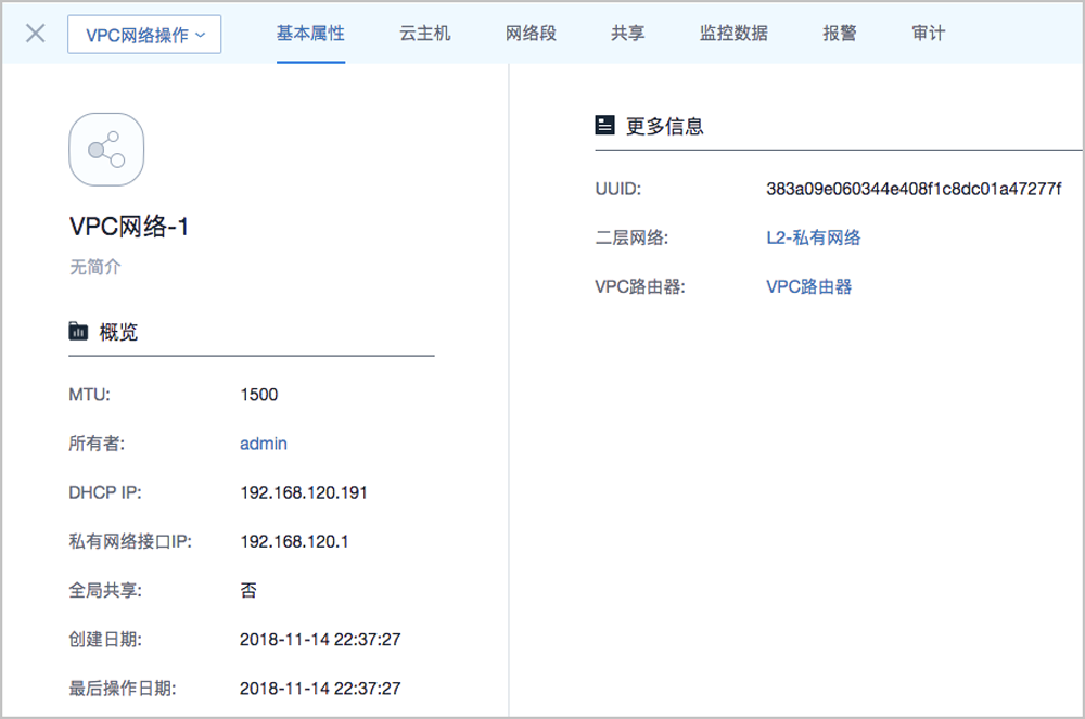 VPC网络详情页包括:基本属性、云主机、网络段、共享、监控数据、报警和审计。