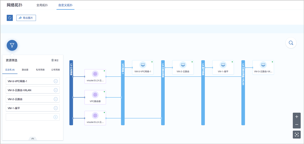 - 指定资源生成拓扑并查看:通过指定资源【目前包括:云主机、路由器(云路由器/VPC路由器)、私有网络、公有网络】,生成相应的拓扑,并直观查看。