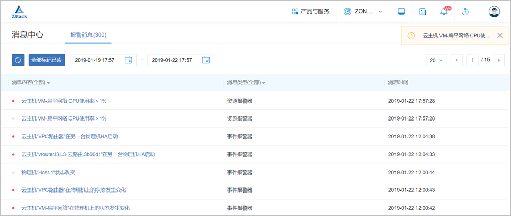 消息中心:ZStack中资源或事件报警消息提示、查看,支持报警消息收敛、报警消息详情跳转报警器/资源详情页等快捷操作,方便用户快速定位问题。
