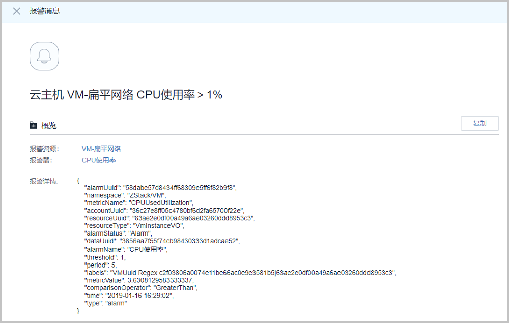 报警消息详情页面显示报警消息的报警资源、报警器、报警详情等信息,其中点击报警资源和报警器名称,可跳转到对应的详情页面。
