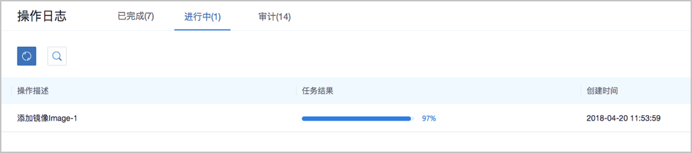 进行中子页面针对进行中的操作提供日志查看,可查看该操作的操作描述、任务结果、任务创建时间。