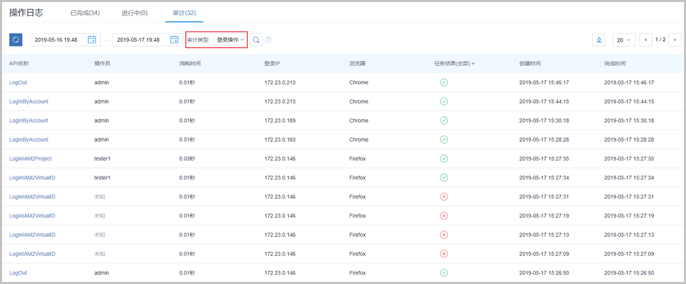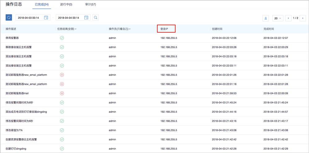 - 支持通过输入操作描述/登录IP,搜索已完成的操作日志。