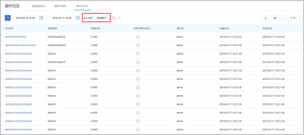 - 支持通过输入资源类型/资源UUID/API名称/操作员,搜索调用API的审计信息。