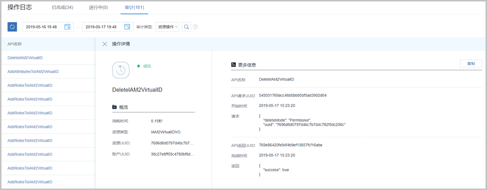 点击资源操作审计消息进入详情页,如Figure 4所示,新增显示开始/完成时间和API请求/返回UUID,更直观的显示审计信息详情。Figure 4. 资源操作审计消息详情