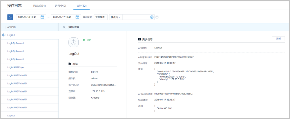 - 登录操作审计针对登录登出的API操作提供审计,可查看该调用API名称、操作员、消耗时间、登录IP、浏览器、任务结果、任务创建/完成时间,以及API行为的消息详情,如Figure 5所示: