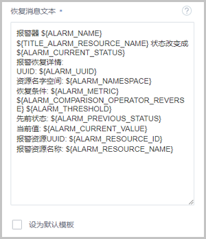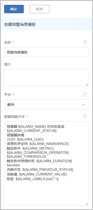 - 设为默认模板:若勾选,会将当前创建的报警消息模板设置为默认模板