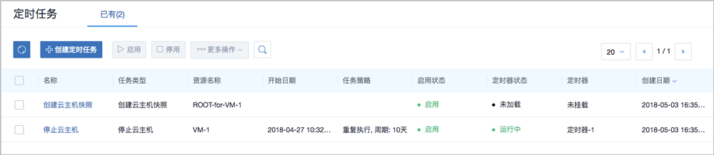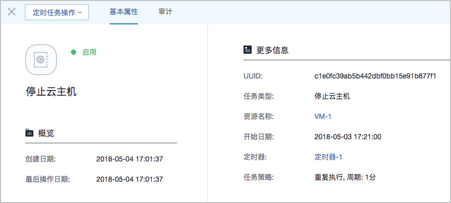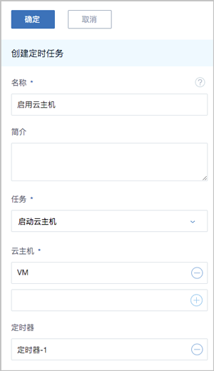 - 任务:选择任务类型。目前支持任务类型包括:启动云主机、停止云主机、重启云主机、创建云主机快照、创建云盘快照