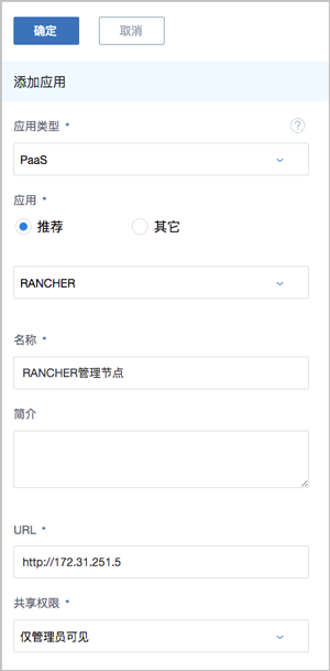 - 应用:选择应用,可选项:推荐(例如RANCHER)、其它