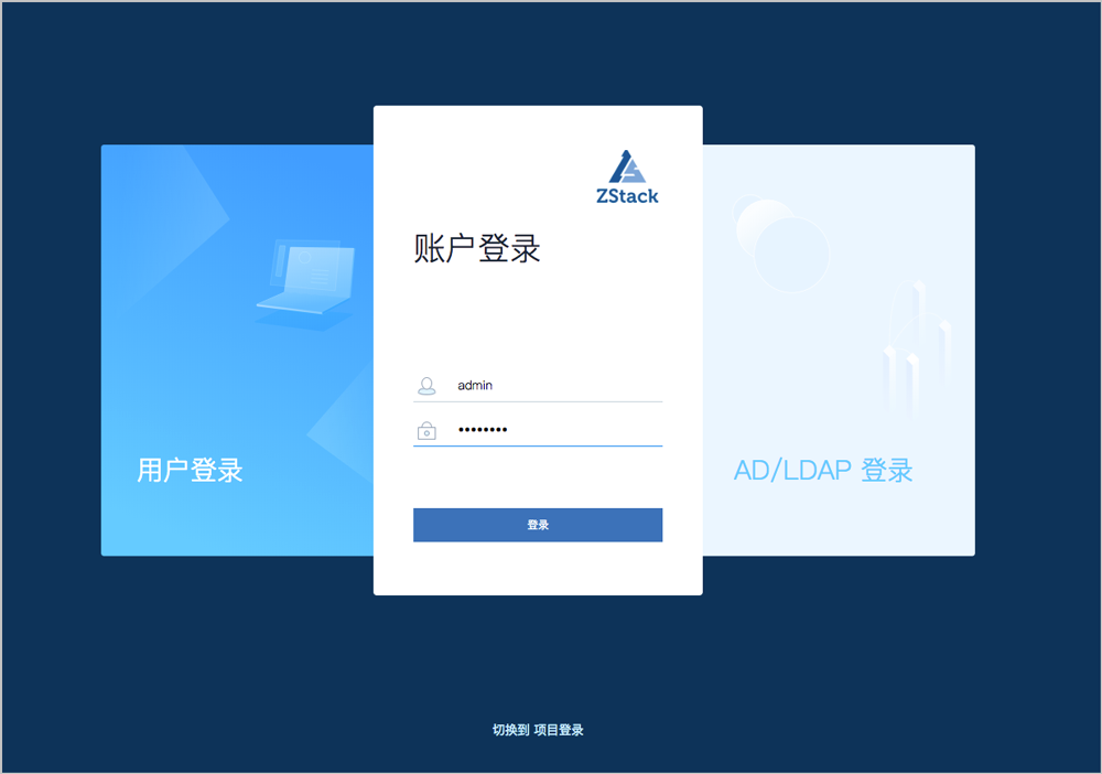 使用Chrome浏览器或FireFox浏览器打开主登录界面(http://your_machine_ip:5000/#/login),admin输入相应用户名和密码登录云平台。