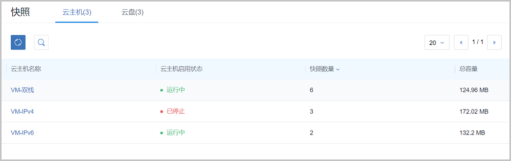 - 云主机:此子界面显示存在快照的云主机列表及云主机名称、云主机启用状态、快照数量、总容量等基本信息。其中: