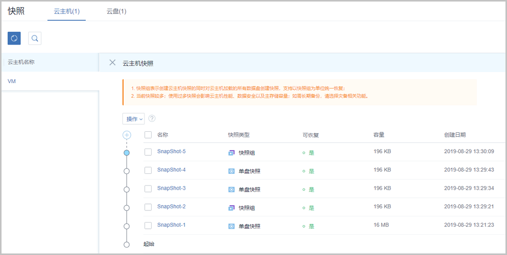 - 使用过多快照(大于5个)会影响云主机性能、数据安全以及主存储容量,若需长期备份,请选择灾备相关功能。