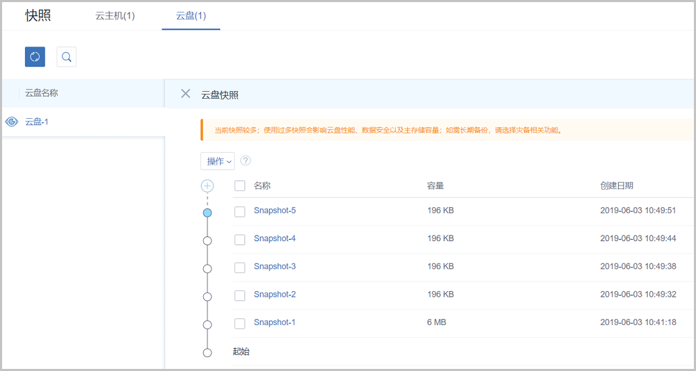 - 使用过多快照会影响云盘性能、数据安全以及主存储容量,若需长期备份,请选择灾备相关功能。