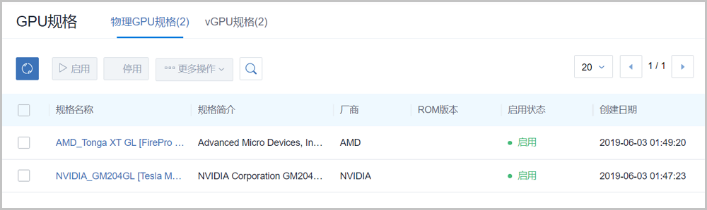 - 物理GPU规格:此子界面显示云平台内所有物理机上被扫描到的物理GPU规格列表及物理GPU规格相关基本信息。