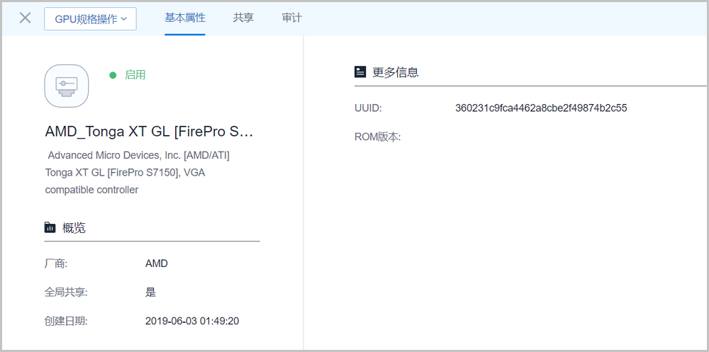 - 基本属性:基本属性子页面显示物理GPU规格名称、厂商、共享状态、ROM版本等基本信息。