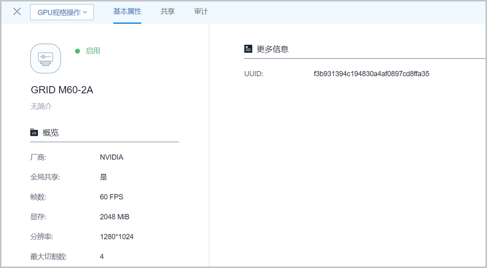 - 基本属性:基本属性子页面显示vGPU规格名称、厂商、共享状态等基本信息。