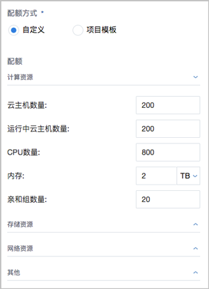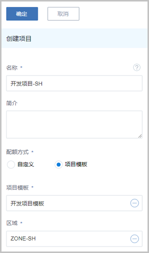 - 项目模板:选择已有的项目模板,可直接使用模板定义的配额来配置项目