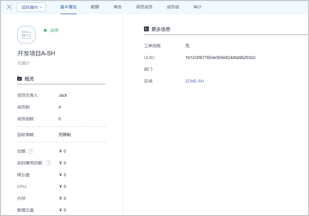 基本属性子页面显示项目名称、成员数、回收策略、工单流程、项目费用、区域等项目相关的基本信息,其中名称、简介、回收策略支持修改。