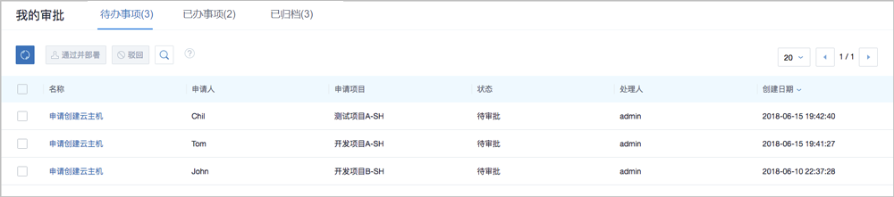 admin拥有工单审批权限,需及时处理工单申请,可审批通过或驳回申请,审批通过后会自动部署,该项目下的资源会立即生效。
