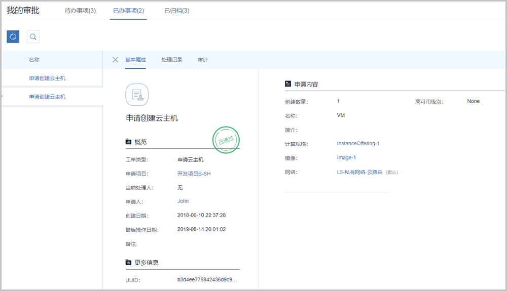 该页面显示已处理的工单,审批通过或驳回的工单均属于已处理工单;