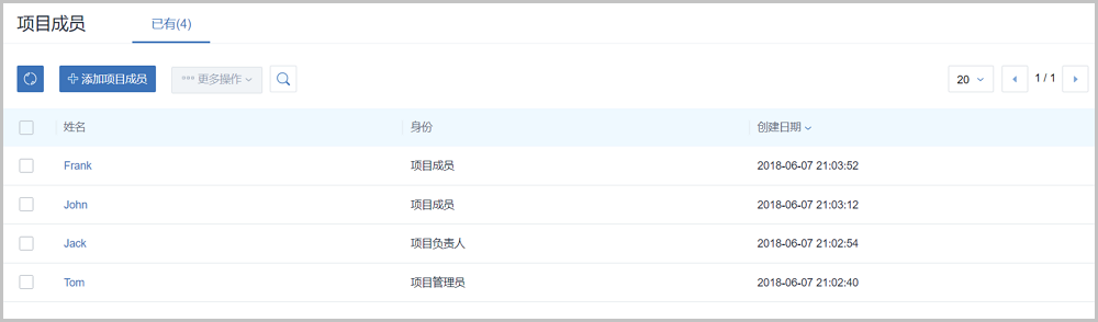 项目成员表示加入项目的用户,作为项目的基本组成人员,包括项目负责人、项目管理员和普通项目成员。项目负责人/项目管理员可添加项目成员,并控制项目成员的相应权限。
