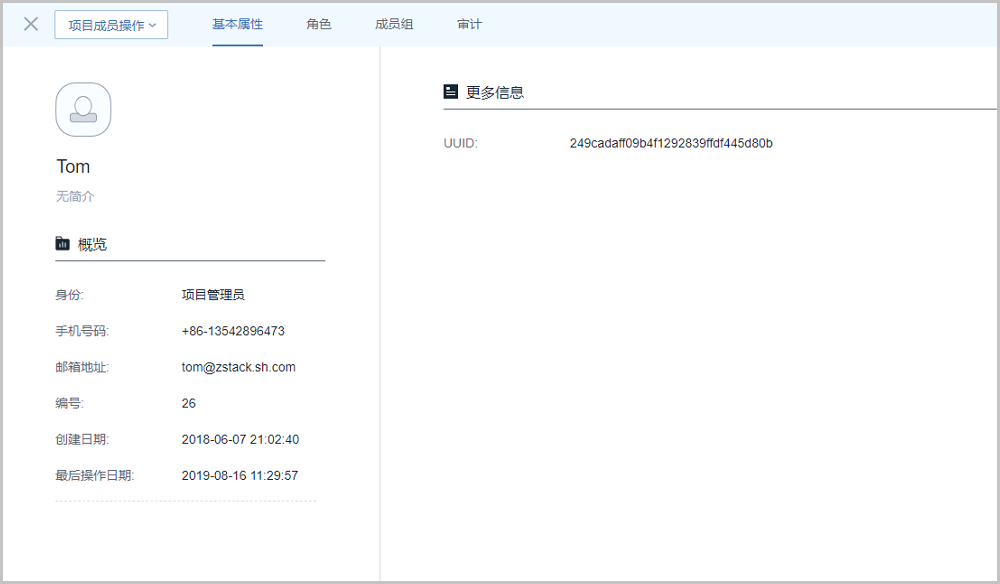 基本属性子页面显示名称、身份、UUID等项目成员相关基本属性。