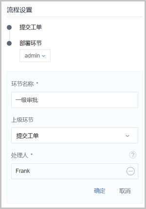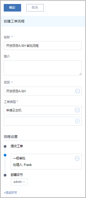 - 点击添加环节可继续添加审批环节,所有环节添加完成后,点击顶部确定按钮,完成工单流程创建