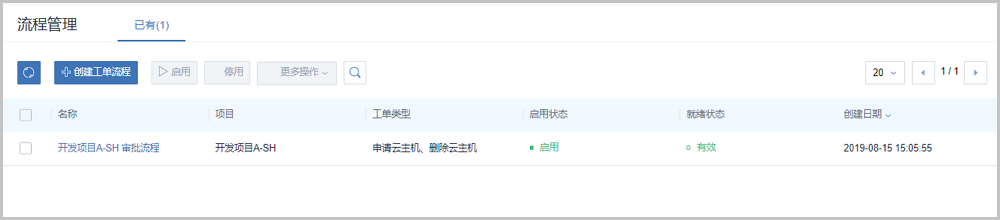 流程管理界面显示了工单流程的基本操作和名称、项目、工单类型、启用状态、就绪状态等基本信息。其中: