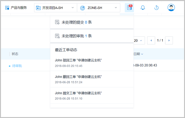 从项目登录界面(http://your_machine_ip:5000/#/project)登录云平台后,可从UI界面右上角的工单消息按钮处快速查看未处理的工单信息,并可跳转至我的审批界面处理工单,如Figure 1所示:Figure 1. 工单消息按钮