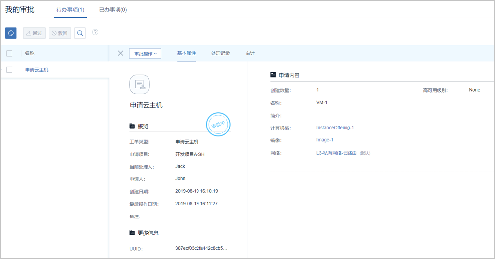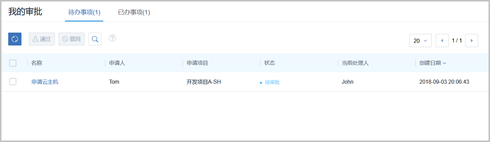 待办事项页面显示待处理的工单,可审批通过或驳回申请。