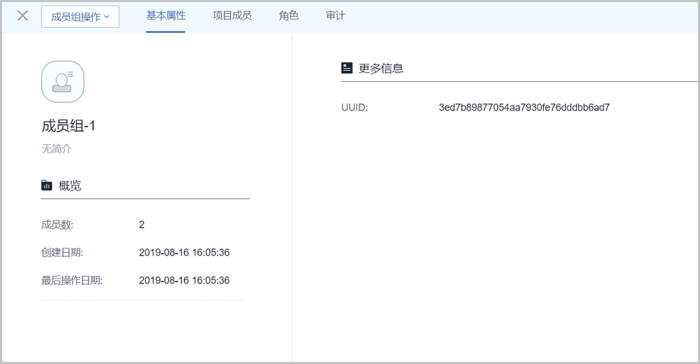 基本属性页面显示名称、简介、成员数等成员组相关的基本信息。