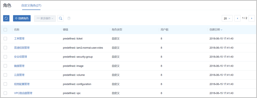 角色表示权限的集合,为用户赋予权限可获得调用相关API进行资源操作的能力。