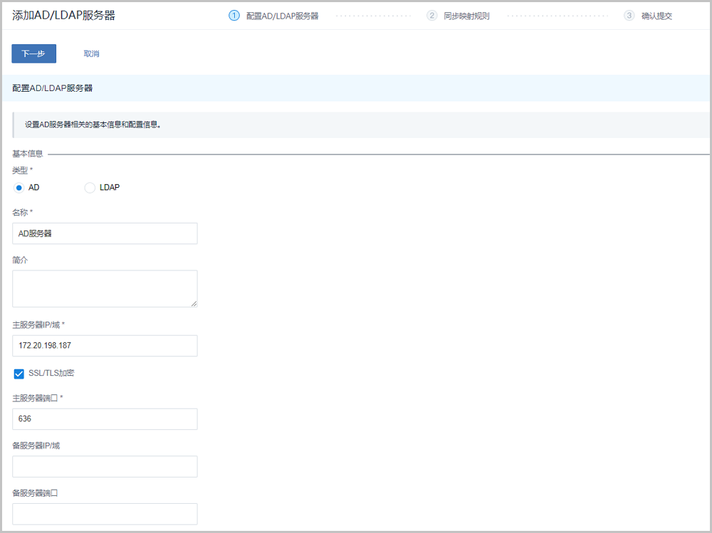 - 配置AD服务器:设置AD服务器相关的基本信息和配置信息可参考以下示例输入相应内容: