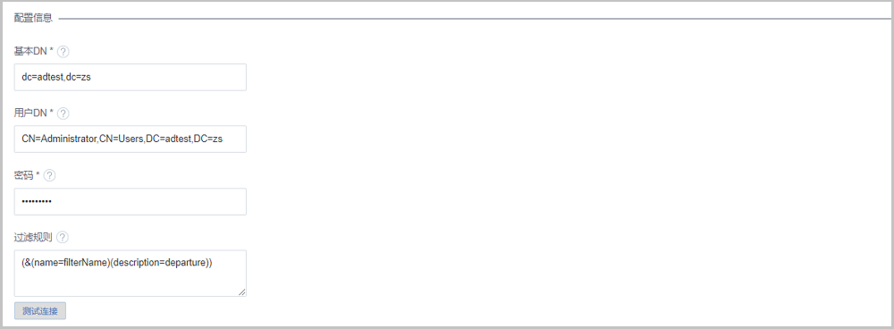 - 用户DN:输入用户DN,拥有查询基本DN范围内所有用户权限的特殊用户,用于登录AD服务器并获取相关数据