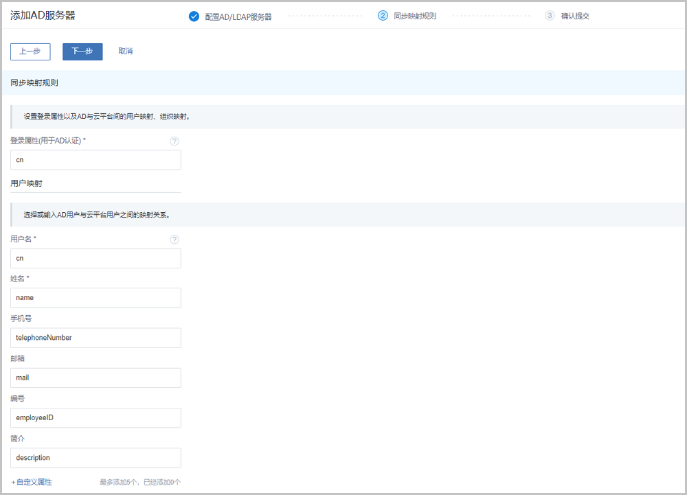- 简介:可选项,设置云平台用户的简介与AD用户的简介映射关系