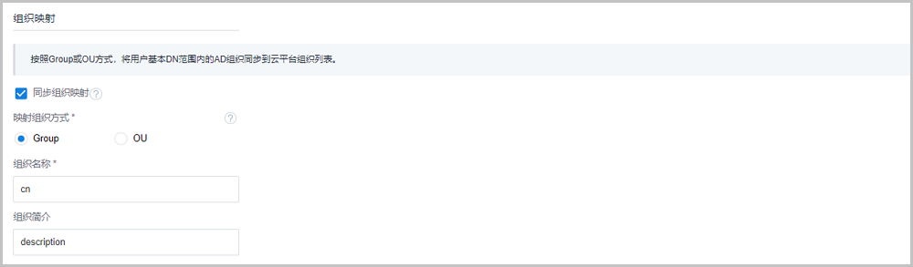 - 组织简介:可选项,设置云平台组织的组织简介与AD组织的组织简介映射关系