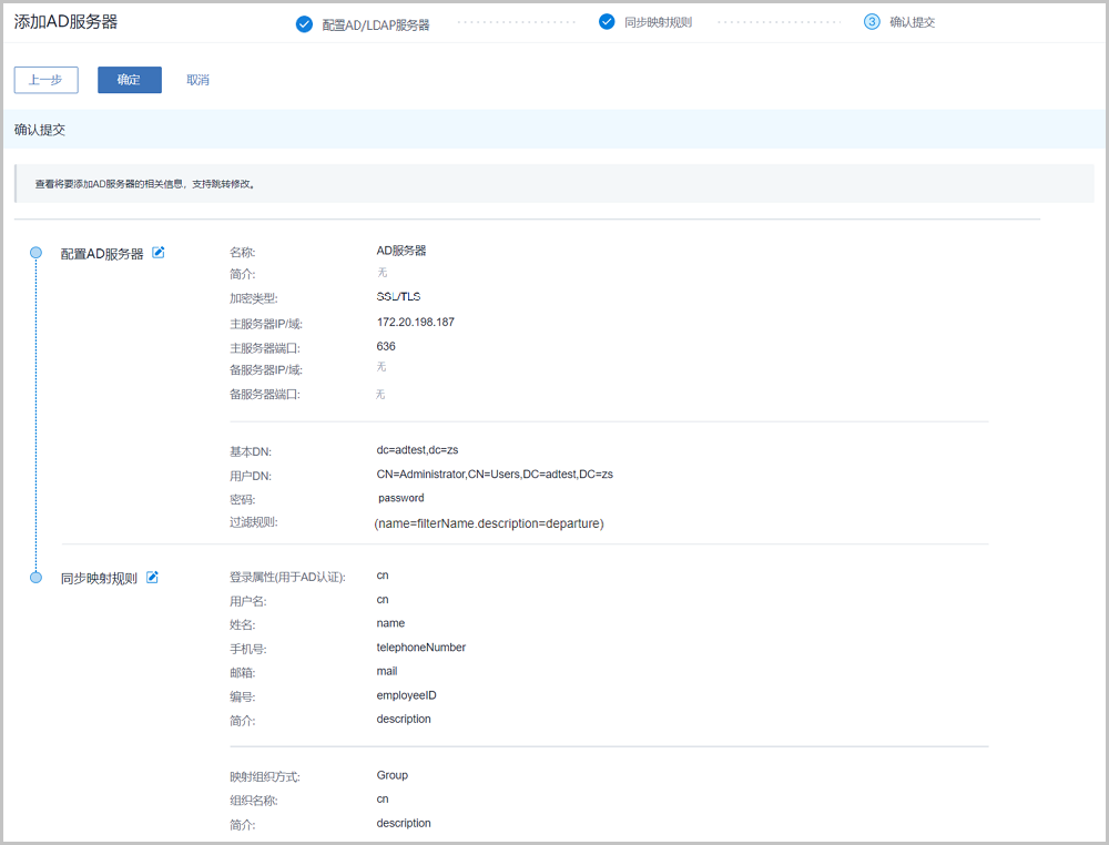- 确认提交:查看将要添加AD服务器的相关信息,支持跳转修改如Figure 4所示: