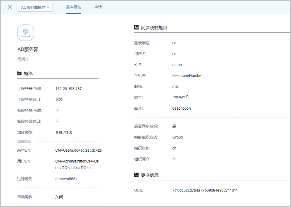 基本属性页面显示名称、简介、概览、同步映射规则等AD服务器相关的基本属性。其中,名称、简介、配置信息、自动同步支持修改。