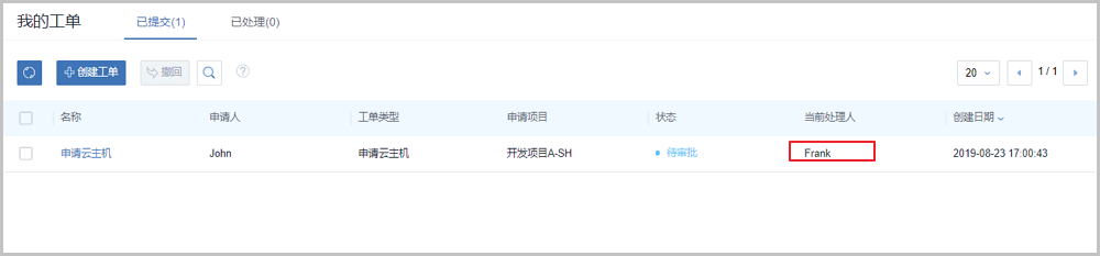 John通过上述流程创建了一个工单:申请云主机,该工单会按照自定义审批流程,首先走到Frank(一级审批),如Figure 6所示:Figure 6. 创建工单完成