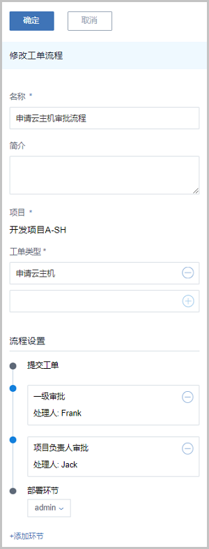 - 点击添加环节可继续添加审批环节,所有环节添加完成后,点击顶部确定按钮,完成工单流程创建