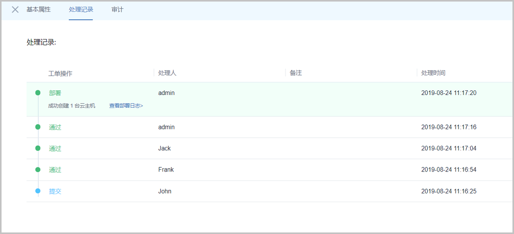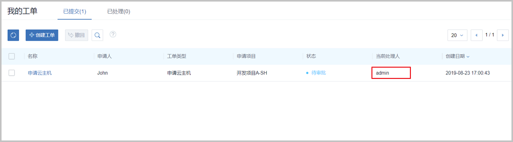 重新提交工单后,该工单会重新回到已提交页面,并使用新流程重新进行。Jack(项目负责人审批)、admin依次通过审批后,将自动部署John申请的云主机。