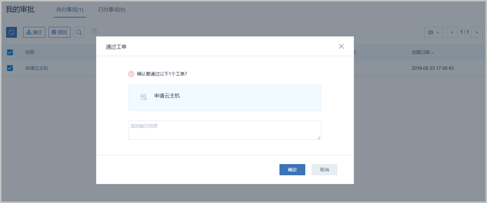 Frank从项目登录界面(http://your_machine_ip:5000/#/project)登录云平台,进入项目,在ZStack私有云主菜单,点击高级功能 > 企业管理 > 工单管理 > 我的审批按钮,在我的审批界面的待办事项子页面,勾选这条工单,点击通过按钮,在弹出的通过工单页面,填写备注信息,点击确定按钮,审批通过该工单,如Figure 7所示: Frank(一级审批)审批完成后,工单将进入已办事项页面,工单流程将进入下一审批环节。Figure 7. Frank通过审批