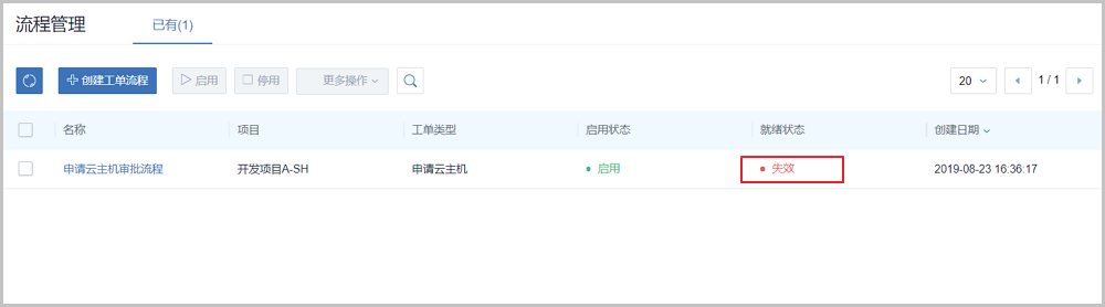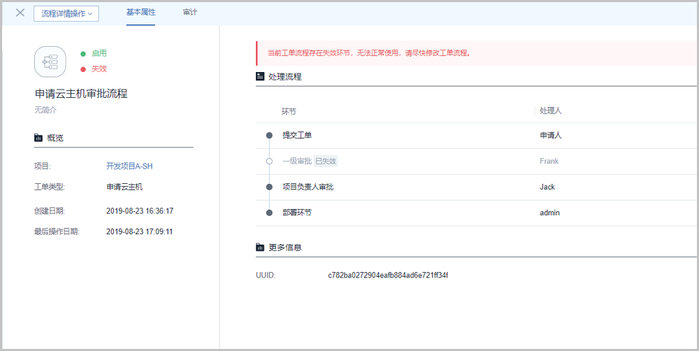 恰巧,此时Frank离开了这个开发项目,Jack(项目管理员)将Frank从项目移除。此时,工单流程失效。流程失效后,John提交的工单将被驳回;且admin看到工单流程就绪状态将显示为失效,如Figure 8所示: 此时,John重新提交工单会报错,需等admin修改审批流程后,才能重新提交工单。Figure 8. admin-工单流程失效