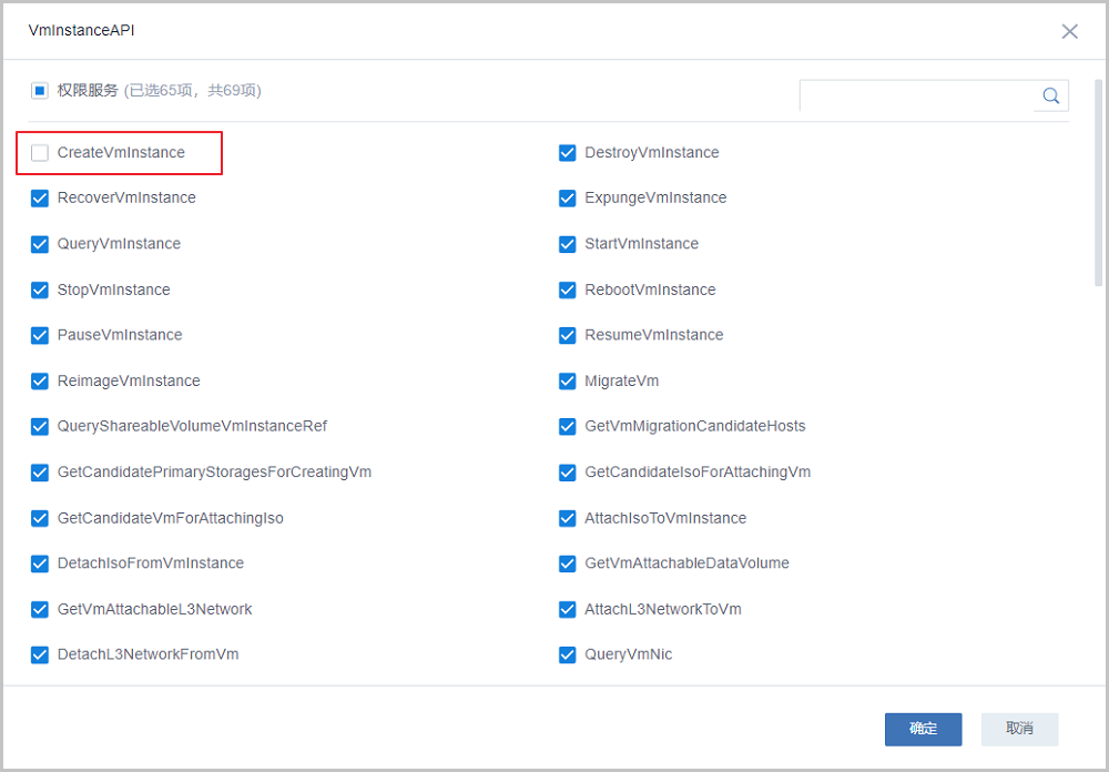 若使用工单申请云主机,建议admin将普通项目成员的创建云主机权限(CreateVmInstance)禁用,如Figure 1所示:Figure 1. 禁用创建云主机权限
