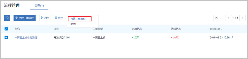 admin需进入流程管理界面,勾选该项目的工单流程,点击更多操作 > 修改工单流程按钮,如Figure 10所示: